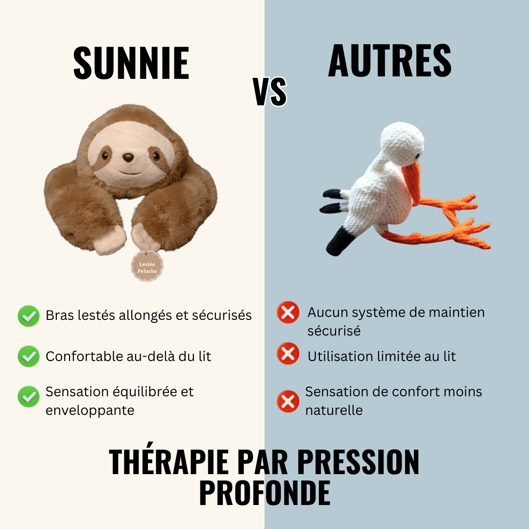 Lorsque vous serrez Sunnie contre vous ou laissez ses bras lestés vous envelopper, votre corps reçoit un signal physique de confort et de protection — aidant le système nerveux à sortir du mode « lutte ou fuite ».